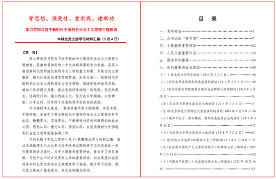 本科生党支部主题教育学习材料汇编截图 机械工程学院第一学生党支部开展“走好中国式现代化之路——学习贯彻习近平新时代中国特色社会主义思想”组织生活会,支部书记、机械学院本科生辅导员张玉卓围绕中国式现代化建设的历程、特征和本质要求进行了导学。 支部启动“强国有我·青年说”微党课、“强国有我·青年行”参观寻访、“强国有我·青年志”实践服务主题教育系统推进计划。