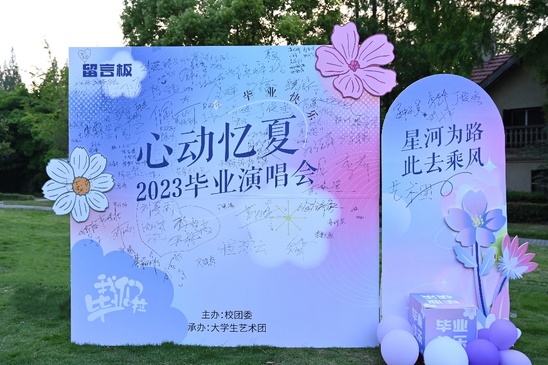 活动现场 青春、音乐,离别、祝福。初夏的午后,阳光正好,同学们围坐在草坪上,享受着飘融在夏日微风里的旋律,整个过程欢声阵阵,温馨美好。活动结束后同学们纷纷在喷绘留言板上签名并合影留念。