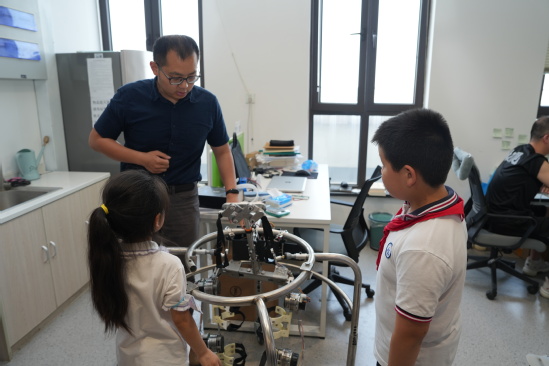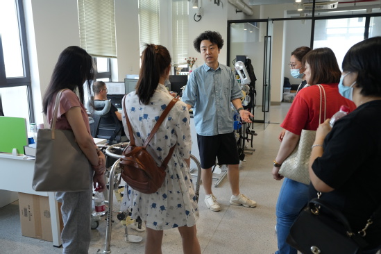王丽以“弘扬爱国主义精神 勇担大学时代使命”为题开启“微党课” “行走”之二——“沉浸式”体验科技创新脉动 “我们获批国内首个康复工程本科专业,2018年泰王国诗琳通公主受邀访问中心并亲自为中心揭牌,我们成功研发出国内首款智能液压假肢膝关节等多种国际领先的康复器械……”上理工副教授王多琎一边介绍着上海康复机械工程技术研究中心的累累硕果,一边向怀一老师们展示着神经康复机器人、康复护理与辅助机器人、智能假肢等科创成果,让大家大开眼界。 怀一小学团员教师王晓雯在参观完表示,研究中心的同学和老师们分别向我们介绍了实验室各个康复机器的研究历史和现状,让我们领略到了上理工康复机械工程技术强大的科研实力,有的机器还在研究中,有的已经技术成熟,相信研究中心参观到的这些形形色色的仪器都能很好地帮助病人复健,让病人有机会能生活的更好。相信的不久的未来也能有更多的人才加入到此行业中,能给人类的未来做出杰出的贡献。