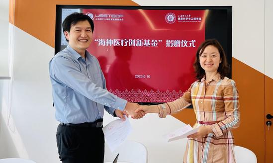 海神研发部经理袁亦金讲话 “共赢是校企能够长期合作的基础,今后企业将和学院继续探索、不断完善人才共育机制、专业共建方案,实现提升学生就业质量和企业人才质量的双赢目标。”袁亦金深有感触地说道。为了更好的实现这个目标,海神医疗公司出资20万设立“海神医疗创新基金”。姚秀雯代表学校教育发展基金会接受捐赠。