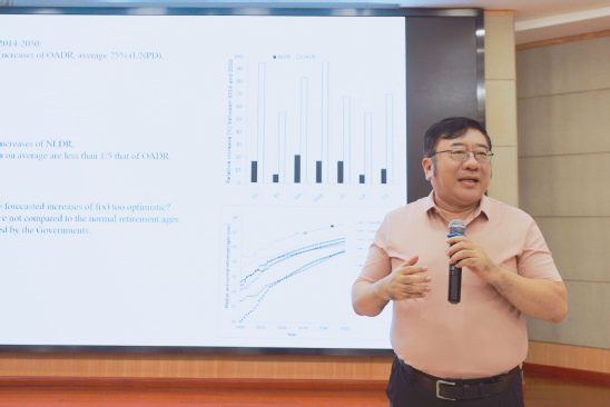 丁晓东主持报告 李南针对目前广泛关注的人口老龄化问题,介绍了一种新型的人口老龄化测算指标——非劳动力负担比(Non-labor-force dependency ratio, NLDR),并将NLDR与传统评估人口老龄化指标的老龄负担比指数(Old-age dependency ratio, OADR)进行了差异化比较。他指出,相较于传统的老龄负担比指数,非劳动力负担比考虑了劳动参与率的增加,可以更加准确地描述和预测人口老龄化带来的负担。他基于联合国的人口预测数据和Lee-Carter方法对G7国家在2050年之前非劳动力负担比变化预测发现,非劳动力负担比增加幅度小于老龄负担比指数的增加幅度,由于老龄负担比指数忽略了劳动力参与率的提高,其对过去G7国家人口老龄化问题的描述是不真实的,而对未来的预测很可能同样不真实,而了解劳动参与率增加的条件和原因可以为研究人口老龄化问题提供有价值的见解。