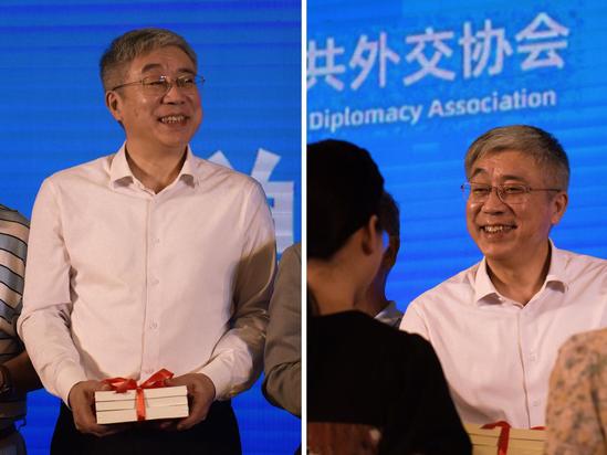 闵师林主持发布会,黄强、孙为民、禹一奇、陈星言、吴寄南进行主题发言(从左至右、从上至下) 主题发言之后,周汉民、王凌宇等领导和专家向现场参加活动的我校研究生代表赠书。王凌宇和专家们对学生的到来表示欢迎、并寄语学生,希望他们能够从书籍中汲取智慧与力量,同时鼓励学生们积极关注中国公共外交事业,未来能够充分地发挥自身专业优势、为中外交流搭建桥梁。