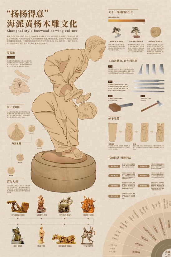 奖项:全国总决赛一等奖 作品名称:扬杨得意: 海派黄杨木雕文化 作者:李彦琪,吴茜明,葛珺怡 指导教师:吕剑,陶海峰 作品简介:本设计结合了中国传统工笔画的绘画风格,以海派黄杨木雕为介绍对象进行绘制,并采用信息可视化的方式整理创作,对其技艺技法、内涵风格等进行全面解读。设计兼具中国古典美与西方油画感,雅韵生动,创意斐然,呼应设计对象“中体西用,博采众长”的核心特色,旨在让海派黄杨木雕这一申城仙葩、民族非遗回归大众视野,使非遗文化的精神定力与价值承载得到延续,“扬杨得意”,生生不息。 供稿:版艺学院 |