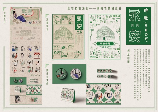 奖项:全国总决赛一等奖 作品名称:永安时SHOW 作者:贾逸风,戴辰敏 指导教师:刘洋 作品简介:灵感取自90年代上海滩的永安月刊月份牌广告,模仿张爱玲插画,运用怀旧复古手绘风格,以动态形式现代数字技术,重现90年代的上海中西文化思想碰撞交流及融合下人民的生活。结合民国时期经典老字号品牌与上海俚语,让人们与90年代产生联系,向大众展示上个世纪的摩登风情。