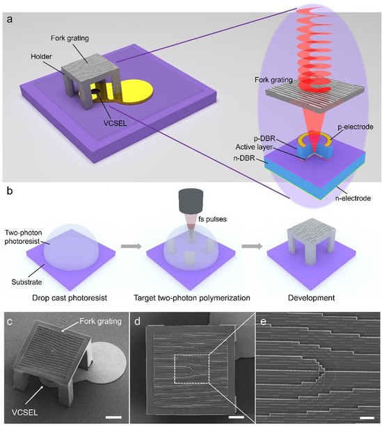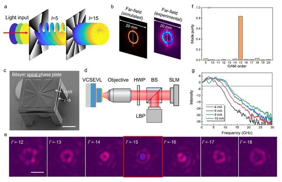近日,光子芯片研究院董毅博博士以第一作者身份在国际知名纳米学期刊《纳米快报》(Nano Letters)上发表了题为“纳米打印集成衍射层的具有可扩展拓扑荷数的垂直腔面发射涡旋光激光器”(Nanoprinted Diffractive Layer Integrated Vertical-Cavity Surface-Emitting Vortex Lasers with Scalable Topological Charge)的研究成果。该成果由光子芯片研究院顾敏院士、方心远副教授团队和中国科学院微电子研究所合作完成,顾敏院士、方心远副教授、中国科学院微电子研究所潘冠中副研究员、荀孟副研究员为本文通讯作者,上海理工大学为第一单位。 随着人工智能、大数据的飞速发展,人类每日产生的数据量也在指数增加,实现高容量的信息复用是应对未来高数据吞吐量应用的有效途径。具有螺旋相位波前的涡旋光携带有轨道角动量,而轨道角动量(Orbital Angular Momentum, OAM)具有的无穷正交特性可被用于各种光学信息复用技术中,来大幅提高信息容量,包括光通信、全息术、光学人工智能、光学加密、光存储等。 涡旋光激光器作为轨道角动量光学信息的发射装置被广泛研究。其中,实现片上、微型的涡旋光激光器对于涡旋光复用技术的芯片化、集成化发展至关重要,能够真正推动这些技术的产业落地。但是,现有的有源微型涡旋光激光器难以产生高阶涡旋光(拓扑荷数普遍小于5),其关键原因是光源的出光面积有限,导致集成的轨道角动量相位结构的分辨率不足,制约了空间带宽积的提高。拓扑荷数越高代表了可能实现的轨道角动量信息复用的通道数越多,因此,这一问题严重制约了轨道角动量片上信息复用的容量提升。 本研究中,作者提出了一种基于激光纳米三维(3D)打印集成轨道角动量相位结构的垂直腔面发射涡旋光激光器,具有体积小、高速度、低阈值、圆形光场、垂直出光、可阵列化的优势。作者通过激光打印微型的轨道角动量相位结构集成在垂直腔面发射激光器表面,从而使激光器发出的高斯光束经过相位结构的调制后变为涡旋光束。激光打印的方法可以扩大轨道角动量相位结构有效光照面积,从而可增大空间带宽积。同时,激光3D打印比此前方法具有较高的制造效率,单个器件的打印仅约为20分钟,而此前方法约为数小时。文章中,作者实现了拓扑荷数从1到5的可寻址涡旋光激光器阵列,单个器件尺寸仅约为100微米×100微米。 本文中作者通过设计3D结构的、级联的螺旋相位板(SPP)进一步来提高空间带宽积,成功实现了最大拓扑荷数为15的涡旋光束。该研究解决了微型涡旋光激光器拓扑荷数提高的问题,有望推动轨道角动量信息复用技术的小型化、集成化发展。 该工作得到了国家自然科学基金委员会和上海市科委等单位的支持。