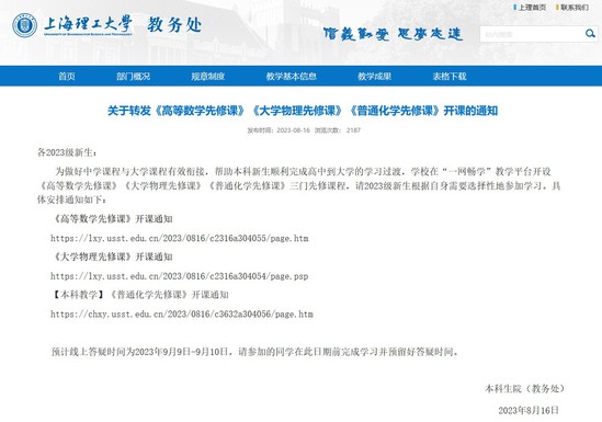 为帮助大一新生更好地适应大学生活,本科生院(教务处)精心准备并组织开展了一系列面向全校新生的学业活动。 本科生院(教务处)协同理学院、材料与化学学院在高考招生结束之际就在“一网畅学”教学平台开设了高等数学、大学物理、普通化学等3门课程先修课辅导课程,每门课由有着多年教学经验的教授主讲的10至15个教学视频组成,同时提供专门的讨论区和线上答疑,让新生更好地实现高中到本科知识的衔接和个性化学习。在先修课堂上,聆听名师课程,感受随时学习、智慧教育的线上知识,数理化三门先修课程一经推出,累计4300余人次学生参加学习,受到了新生的广泛好评。“学校为我们开设的先修课打消了我对大学学习的忐忑,逐一解答了我的各种疑惑,让我更明晰大学学习规划。”2023级工科试验班的学生说到。