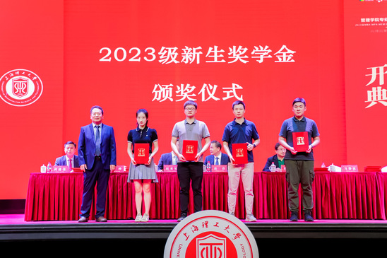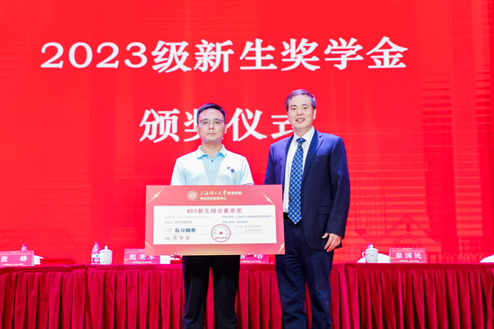 校徽佩戴 赵来军在致辞中回顾了管理学院成立以来的历史成绩,展望学院未来发展方向。他向同学提出三点建议:一是描绘蓝图,规划人生。在学习阶段,要明确目标,才能成就非凡成绩。二是笃实好学,追求卓越。希望同学们通过两年学习积累,实现自我超越。三是团结友爱,合作共赢。“利他”是商业的起点,合作共赢才会有更多机遇。 为鼓励优秀学生报考上理管院专业学位项目,在校期间勤奋学习、全面发展,培养具有社会责任感、勇于担当的管理精英,学院特设“新生诚意奖学金”“校友奖学金”“联考成绩奖学金”“综合素质奖学金”等一系列“多层次、全覆盖、多重奖学金”计划。今年有不少优秀同学脱颖而出,马静波宣读“2023年新生奖学金获奖名单”,主席台嘉宾为获奖者颁奖。