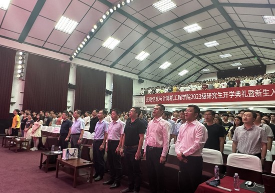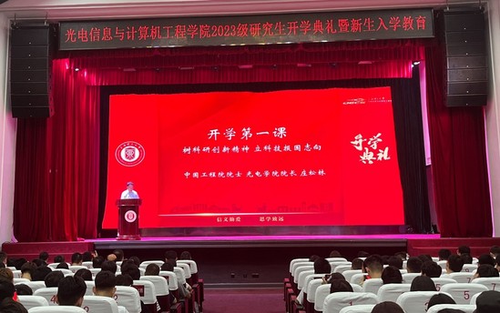 吹响奋进号角,开启“追光人生”。9月6日晚,光电学院2023级研究生开学典礼暨新生入学教育在大礼堂举行,662名研究生新生带着责任、使命与梦想齐聚在这里,共筑中国梦。中国工程院院士、光电学院院长庄松林及学院党政领导、师生代表出席,学院党委书记袁媛主持典礼。 伴随着庄严的国歌声,典礼正式拉开帷幕。首先,庄松林院士以“树科研创新精神,立科技报国志向”为题为同学们讲授开学第一课。他通过讲述自身的科研奋斗经历向全体研究生新生提出了将个人梦融入中国梦的倡议。他谈到,当代青年应响应国家和时代召唤,勇于承担时代责任,秉持坚定的信念和正确的人生价值观,立志为国家富强、社会进步和人民幸福而努力读书、奉献自我。他勉励光电学子要潜心求学、砥砺奋进,脚踏实地、心比天高,坚持耕耘、成就梦想。 学院党务副院长、党委副书记张大伟向同学们介绍了学校和学院的发展历程,并从学术科研、师资队伍、人才培养和社会服务等方面介绍了学院近年来取得的可喜成绩。他指出,学院今后将持续以立德树人为根本任务,以国家重大战略需求为导向,放眼国际、对标先进,以刀刃向内的勇气和担当加快推进各项改革,推动学院事业发展迈向新台阶,为国家紧缺人才培养和关键技术突破而努力奋斗,他希望同学们要珍惜宝贵的求学机会,以“时不我待”“强国有我”的精神和魄力时刻督促自己,以庄松林院士为榜样爱党爱国、甘于奉献,励精图治,全面发展,为国家现代化建设和中华民族伟大复兴不懈奋斗打下坚实基础。 学院光电信息工程系教师冯吉军作为导师代表发言,他谈到,近年来学院着力打造的师生共同体、科创联合体和行业协作体为同学们提供了良好的学术科研环境和平台。作为新一届研究生,同学们前行的道路上将面临新的坎坷和挑战,这段旅途将充满未知、充满挑战,但也将充满机会和成长。这不仅是一条充满未知与艰辛的求学之路,也是一条实现远大理想的自我之路。只要同学们积极探索,在坚持不懈中守正创新,必定攀登上属于大家的科研高峰。 光学工程专业博士张世杰分享了自己的学习经验和心得。他勉励新生新时代青年应该具备执着追求、永不言弃的科研精神,不断提升自我、坚定理想、肩负起实现中华民族伟大复兴的历史使命。新时代青年应珍惜学习机会,在学习中发现问题、分析问题并解决问题。他鼓励师弟师妹们要凝聚力量,形成团结奋斗的科研光彩,挥洒在党和人民需要的地方,坚信成功一定属于满腔热血、充满激情的新时代青年。 典礼后,副院长彭敦陆为新生们进行了研究生教学培养管理、学风建设与学术道德的解读和宣讲。