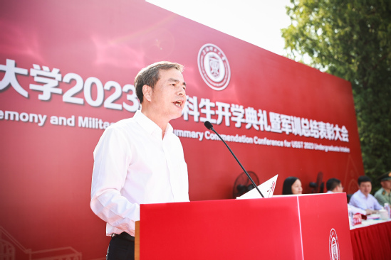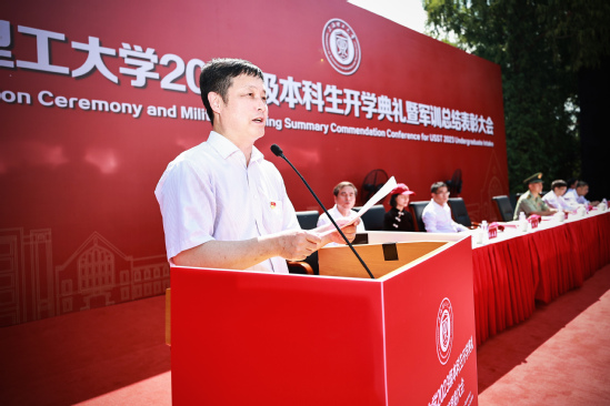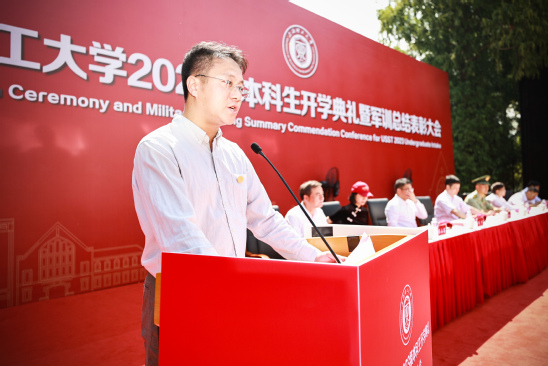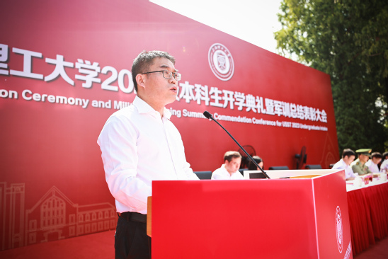 教师代表戴博教授发言 校长丁晓东以“未来工程人才,从上理出发”为题发表讲话,他向2023级新同学表示热烈欢迎,向辛劳付出的承训教官们表示衷心的感谢。他系统全面地向全体新生介绍了学校的发展文脉和校园文化,重点聚焦学校工程教育特色,阐述了学校卓越工程人才培养的目标。他希望同学们将个人发展与国家发展紧密结合起来,要从实践学习、协同学习、全面学习、智慧学习出发,聚焦于国家与社会需要,“把故事讲给社会听”。同时他殷切期望同学们要以上理人的务实精神,学会在“大工程”时代背景下,学会平衡、沟通、组织与管理,要将自己塑造成能够解决复杂工程问题的复合型创新人才。在人机深度融合的新图景徐徐展开的新时代,他勉励同学们主动思考“为什么而学、学成为怎样的人”这样的时代之问,要珍惜大学时光,铭记“信义勤爱 思学志远”的校训,传承“爱国图强、开放包容、敢为人先、追求卓越”的上理精神,享受基于工程的学习过程,掌握科学和技术,读懂社会与人生,成为灵性而有趣的人,成为气贯大世界的国之栋梁,勇担科技报国、制造强国、民族复兴的使命,为中国式现代化贡献青春力量。