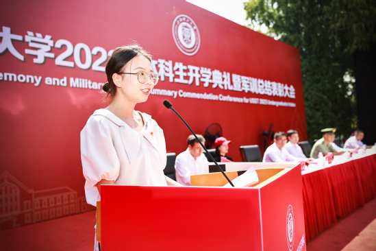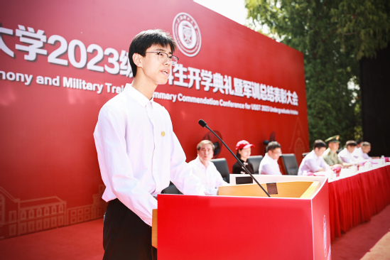 全体领导为受表彰人员代表颁奖 丁晓东向承训的武警上海总队某部赠送书法作品《与子同袍》。“威武之师耀上理,军校携手育栋梁。”全体师生对长期以来鼎力支持和关心我校军训以及国防教育工作的武警上海总队某部全体官兵表示深深的谢意和崇高的敬意。 基础学院2023级本科生沈陈鹏举作为新生代表发言,他表示,历经高考与军训的洗礼,新上理人将在百年历史底蕴的沪江园中,不畏艰险、不惧挑战,切实躬身践行“信义勤爱 思学志远”的校训精神,承载着上理的希望与荣光。 健康科学与工程学院2020级本科生田永吉作为老生代表分享了她在上理的学习与生活。她以“一封信”的形式将自己的经历娓娓道来,亲切地向新生分享她的经验与感悟。她勉励新生“在追风的年纪,莫等风来”,学会自律、勇于尝试、不断探索与实践,立志高远,在接下来的四年里寻梦而行,向阳而生。 光电信息与计算机工程学院戴博教授代表全体教师发言。他向新生讲述“学会学习”与“敢于梦想”的重要性,希望大家能够在今后的学习工作中,找到一个最适合自己的学习方法,在上海理工大学找到人生的梦想,勇于筑梦、勤于追梦、幸福圆梦,用勤奋的态度和高效的方法实现自己的梦想。