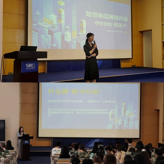 2023级辅导员团队与学友团队 “安全教育”新启航·防诈消防深入学 新生安全教育是入学后必不可少的一环,今年除了邀请来自沪西高校派出所的邵警官进行反诈宣传外,也邀请到了来自中国银行卢湾支行营业部主任陆芸和副主任肖佳玲为新生同学带来了防范电信网络诈骗的实用建议和方法。同时,为了将理论付诸实践,在学校保卫处的大力支持下,学院首次面向全体新生开展了消防演习,真正提升了广大师生的消防安全意识和逃生自救能力。