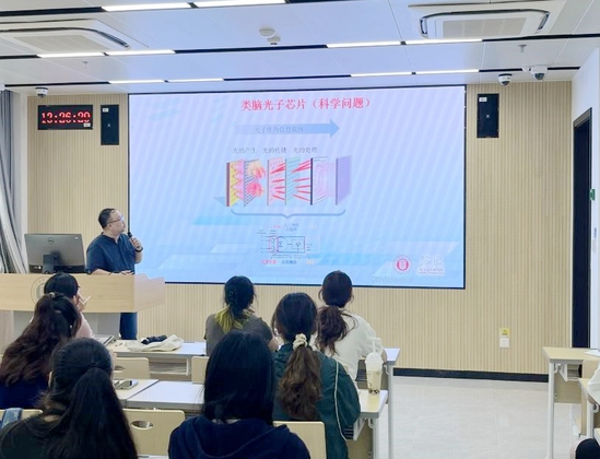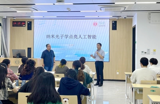 牛海主持报告会 张启明以人工智能的发展历程开篇向同学们详细介绍了人工智能的内涵、发展现状以及应用前景,随后通过对光学实验原理和实际转化的讲解向同学们讲述了纳米光子学与人工智能技术交叉应用相辅相成的发展过程。他强调,只有不局限于现有的体系,系统性促进光学、纳米光子学、材料学、计算科学等学科交叉融合发展,才有可能促使“全光”的光学神经网络的诞生,实现以光的速度为基准的人工智能计算,并最终促使一个全新的人工智能时代早日到来。研发先进的光学人工智能技术,实现更智能、更快捷、更绿色的未来是每一个光学人的使命,他鼓励同学们潜心探索未知,追寻真理,勇于“发现光、追逐光、成为光、散发光”。