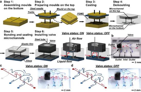 近日,上海理工大学博士研究生黄邵祺、郑璐璐副教授与中国科学院深圳先进技术研究院研究员巫建东以第一作者身份在《自然》旗下期刊《微系统与纳米工程》(Microsystems & Nanoengineering)上发表论文,论文创新提出了“活字印刷式3D模块化微流控制造技术”,该成果由未来光学团队庄松林院士、张大伟教授带领的超精密光学制造团队与中国科学院深圳先进技术研究院、加拿大曼尼托巴大学合作完成,上海理工大学戴博教授、张大伟教授和加拿大曼尼托巴大学Francis Lin教授为通讯作者。 模块化微流控制造技术通过组装各种预制的模块,拼搭出整个微流控系统。近些年,各种模块制造技术及模块组装技术陆续被提出。模块的制造可以通过在晶圆上制备多种微结构,再用类似聚二甲基硅氧烷(PDMS)的弹性材料复刻出模块结构。这些模块可以通过粘接灵活地组装成一个完整的系统。此外,微流控模块也可以利用3D打印制造。 然而,同时满足高打印分辨率、高表面光滑度,以及采用具有生物化学相容性和高度光学透过率的打印材料,对于3D打印技术是一个巨大的挑战。即便使用3D打印模具或铝模具复制PDMS模块,也会因为反复制造模块效率较低,而无法满足小批量生产的需求。此外,研究人员提出了改造注塑模块(如乐高组件)的方案,但该方案较难实现3D结构,且实现几十微米的改造精度也存在难度。除了以上提及的难处,现有的模块化微流控技术难以将功能器件标准化,实现一体化微流控系统。 本研究受活字印刷术的启发,提出了一种3D模块化微流控(3D-FAMM)制造技术,为各种微流体控制模具以及各类功能性器件(阀门、照明光源、显微相机)制定了模块化标准。通过倒模复刻已组装的模具,可制造出复杂结构的微流控系统。研究中,利用3D模块化系统演示了多种应用,包括生成复杂浓度梯度,生成和操控微液滴,以及捕获和共培养细胞。3D模块化技术可以快速制造出各种微流控系统的原型样件,构建片上研究平台,实现高效的概念验证或产品开发阶段的测试及小批量制造。3D模块化技术功能性强、灵活性高,在生命科学领域具有广阔的应用前景。
