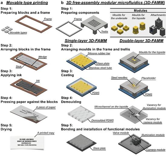 活字印刷术和3D模块化微流控制造术原理图