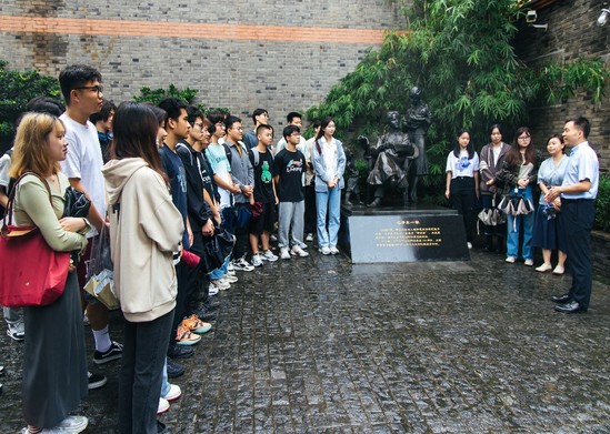 在毛泽东旧居合影 在毛泽东旧居,牛海介绍了活动的意义,就毛泽东思想与中国式现代化的关系进行了讲解。在毛泽东一家四口的雕像前,他表示,学校党委和学院都非常重视思政课教学的效果,尽可能创造条件让大家多角度、立体化的去理解思政课的内容。虽然社会的发展是多维的,但也是有主线的,新民主主义革命以来,我国社会的主线就是在马克思主义中国化时代化的进程中寻找民族复兴的正确道路。这条道路最主要的奠基者就是毛泽东同志,他是铺路者、带路者,通过此次现场教学,大家可以走近他当年的所思所想。 牛海在毛泽东故居给学生讲解 看懂革命故事,走进历史悟教材。毛泽东旧居是毛泽东在上海居住时间最长的一处旧居,分为常规展厅、实物展厅和毛泽东旧居三个部分,牛海和李梅敬带领同学们将展厅内容和教材内容有机结合,为同学们讲述了毛泽东在上海找到马克思主义信仰、组建共产党早期组织、召开党的代表大会、开展国共合作以及合作破裂之后的工农联盟等问题。同学们听得很认真,深刻了解了毛泽东为什么重视无产阶级在民主革命中的领导权问题以及如何找到工农联盟这条道路的,让教材的理论知识变得鲜活起来。