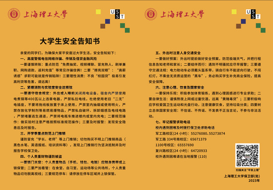 新学期伊始,也是各类安全事故与治安案件的高发期。为有效提高新生安全防范意识,营造良好的校园安全文化氛围,建设平安上理、文明校园,保卫处精心策划并积极开展了一系列新生入学安全教育工作。 织密防护网,营造全方位校园安全氛围 保卫处紧抓新生入学关键节点提前谋划,与属地派出所、消防支队等联合制作《大学生安全告知书》,附于近7000名新生的录取通知书材料中,使新生树立安全理念,提高防范意识。告知书内容涵盖国家安全、防范诈骗、交通安全、宿舍用电安全等十项内容,对大学生校园生活方方面面的安全注意事项作全面提示。“平安上理”微信公众号、校内电子宣传栏等提前发布相关安全提示;制作安全提示PPT发放至各学院,作为新生入学认知教育必修内容。保卫处还开设面向大一学生的“大学生公共安全教育”课程,发挥第一课堂主阵地作用,构建“三个课堂”安全教育阵地体系,全面做好安全育人,全方位营造校园安全文化氛围。