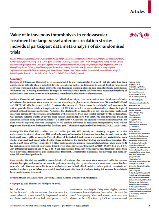 近日,东方泛血管器械创新学院交叉团队联合全球多个研究团队的最新成果在线发表于临床医学顶级期刊《柳叶刀》(The Lancet),论文题为“改善急性缺血性卒中再灌注策略研究”(Improving Reperfusion Strategies in Acute Ischaemic Stroke, IRIS),为提升全球卒中临床实践水平贡献了重要力量,扩大了中国学者在脑血管病介入治疗领域的国际影响力。上海理工大学东方泛血管器械创新学院为该文章共同第一作者和共同通讯作者联合署名单位。 近年来,随着深入开展临床研究,动脉取栓已被认为是前循环大血管闭塞性急性缺血性卒中的最有效标准治疗方法。这一方法明显改善患者的临床结局并减少残留症状,但是否需要在动脉取栓(EVT)之前进行静脉溶栓(IVT)一直存在国际争议,因为静脉溶栓可能增加出血风险、延迟取栓时间并增加治疗成本等问题。因此,全球各地的研究人员纷纷展开高质量的临床研究以解决这一问题。到目前为止,全球已有六项关于这一问题的高质量临床研究发表在国际著名期刊上。然而,由于这些研究在设计、入组数量、研究人群和基线数据等方面存在差异,六项研究的结果并不一致。因此,迫切需要进行基于高质量的随机对照试验研究(RCT)个体数据的综合分析,以获得更高级别的循证医学证据,这将有助于指导全球卒中治疗实践。 基于此,东方泛血管器械创新学院交叉团队与荷兰、瑞士等国专家发起,联合六项随机对照试验研究团队,共同开展了改善急性缺血性卒中再灌注策略研究。该研究采用非劣效检验设计,通过全球相关学会广泛调研确定了最受同行认可的非劣效界值,最终纳入来自中国、荷兰、瑞士、澳大利亚、新西兰、日本、加拿大、越南等8个国家207个研究中心的2314例患者。 研究结果发现,基于5%的非劣效界值,未证实直接取栓不劣于桥接取栓(校正后OR值,0.89;95%可信区间,0.76-1.04);与此同时,特别值得关注的是,本研究也未能证实桥接治疗优于直接取栓。两种治疗方法之间差异极小,仅有1.7%的结局差异。这意味着对于符合动脉取栓和静脉溶栓治疗条件的患者,每桥接治疗57例患者,才可能使1例患者较单纯动脉取栓额外获益。我们应该从成本效益、患者特点、预期延误等方面予以个体化精准决策,相关亚组研究工作正在紧锣密鼓分析中。 该项成果的发布,不仅代表着东方泛血管器械创新学院交叉团队在脑血管疾病治疗领域的重大突破,更是医工交叉研究的一个新起点。东方泛血管器械创新学院拥有独特的天赋和地理优势,同时聚集了众多卓越的学术人才,这将成为未来研究和创新的强大动力。这项成果将吸引更多的学者和跨学科专家加入,一同探索,一同创新,促进医疗水平跨越式提升,为患者提供更多重获新生的希望。
