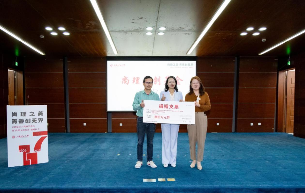 叶磊为校外导师颁发聘书 “新起点新动力指引新未来” 恰逢上海理工大学117周年校庆之际,为支持母校文化创意事业发展,第一届优秀校友、版艺学院上海校友会会长、上海魔方企业形象设计有限公司总经理陈国良,杰出校友、胧爱集团董事长蒋公宝,优秀校友、浙江奥思伟尔电动科技有限公司董事长曹冠晖共同捐资80万元设立“尚理文创基金”,旨在用于开展学校文化创意领域的教学、科研、竞赛等创新创业活动。司徒唯尔代表学校教育发展基金会接受校友捐赠。
