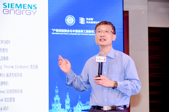 Peter Hergenmöller作报告 西门子能源工业解决方案事业部总经理秦政在作了题为“西门子能源工业解决方案事业部在能源转型方面的实践”的主旨报告,他介绍了近年来西门子能源工业解决方案事业部的能源转型,减少碳排放的实践,并提出与学校加强合作以更新知识和实现知识结构转型的构想。
