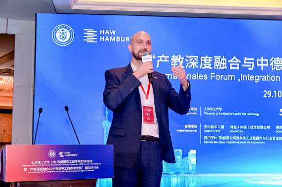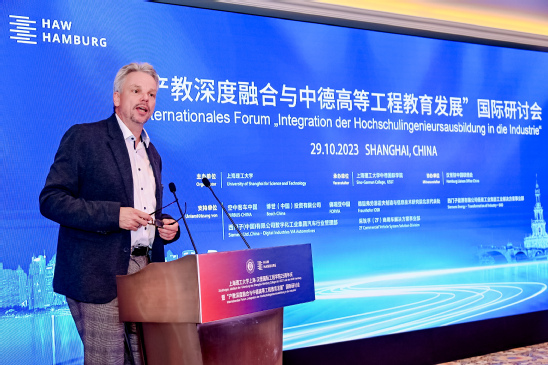穆宏作报告 胡特教授以“中德高等工程教育产教融合的实践与思考——上海-汉堡国际工程学院为例”为题作了主题报告。他提出以实践位主导的工程领域教学以及学生培养需要校企之间的紧密合作。上海理工大学和汉堡应用技术大学共同协办的上海-汉堡国际工程学院是一项业内有名的中德“灯塔”项目。他还详细介绍了中德两国工业界紧密相关的学习和思路概念,以及介绍了按行业标准实行的系统性强化培训和实习学期,并对中德合作办学的现状和未来他挑战进行了研讨。