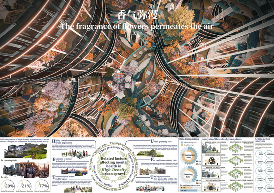 本届竞赛的主题“至美而生——在高密度城市蔓延中为心理健康而设计”具有极高的现实意义和挑战性。在这个城市化快速发展的时代,如何在高密度城市中为人们创造一个身心健康的生活环境是一个值得深入探讨的问题。《花香弥漫》恰恰符合这一主题要求,通过建筑与绿化的有机结合,“将自然请回城市、在城市中创造自然”为人们提供了充满花香、宁静祥和的生活空间和建筑系统。