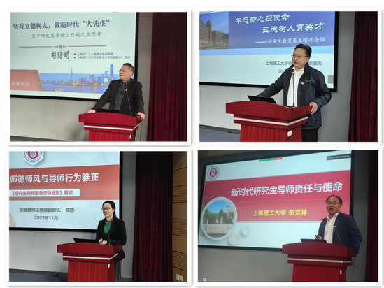 孙跃东致辞 会上,马克思主义学院副院长、党的二十大精神专家宣讲团成员胡绪明教授以中华优秀传统文化教育强国思想、习近平总书记关于教育强国的重要论述为切入点,结合自身研究生教育经验分享了做新时代“大先生”的几点思考。他指出“大德为本”是师者之道,“大爱为魂”是教育之本,“大智为基”是为师之技,“大局为重”是教育之用。研究生院副院长崔国民以“不忘初心担使命 立德树人育英才”为题作主题报告,介绍了我校学位与研究生教育的整体情况、特色工作及一流研究生人才培养行动计划推进情况,同时分享了自己指导研究生的心得体会。教工部副部长郑静以“新时代师德师风与导师行为雅正”为题对教育部下发的《研究生导师指导行为准则》进行深入解读和案例分析。研工部部长彭宗祥作题为“新时代研究生导师责任与使命”的报告,通过剖析当前研究生思想政治教育的形势与任务,强调了研究生导师履职尽责的重要性,深入交流了关于研究生导师落实立德树人职责的思考。