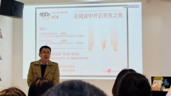 11月28日下午,“辑客出发”讲书团走进上理工第二期“在阅读中开启美食之旅”在我校德国文化交流中心举行。本活动由上海市新闻出版局、上海市出版协会主办,上海理工大学、上海世纪出版集团承办。上海市新闻出版局出版处副处长吕瑞锋,上海世纪出版集团组织人事处副处长刘亚明,我校国际交流处、版艺学院相关领导及40余名师生参加活动。 活动伊始,吕瑞锋在致辞中表示,“辑客出发”走进上理工的第一期举办后获得了良好反响,希望可以继续通过“辑客出发”的平台,借助上海出版行业的品牌效应和优势资源,在高校学生中推进阅读文化,营造浓厚的读书氛围。
