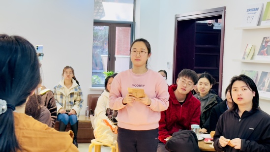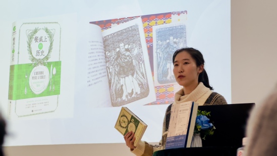 吕瑞锋致辞 本次活动的主讲嘉宾是上海社会科学院出版社编辑章斯睿、上海文化出版社编辑王茗斐。章斯睿就《江南烟火:有滋有味的百年民间饮食》一书进行了分享,介绍了板栗、羊肉、黄酒等书中所描绘的江南地区各时令季节的不同食材,并讲述了食材背后所蕴含的故事和文化内涵,让同学们深感江南饮食文化的精致、细腻。王茗斐就《餐厅里的革命:从独乐乐到众乐乐》一书进行了分享,她梳理了饮食类图书的书写方式以及新媒体对饮食类图书的传播作用,并结合书中内容为大家介绍了法国餐饮习惯的演变以及法餐在世界上普及传播的过程。 互动环节,嘉宾和学生们关于预制菜、餐饮老字号的衰落等近期热点话题进行了讨论。活动现场还准备了糖炒栗子、牛角包等两本书目中提到的食物,同学们一边聆听嘉宾的介绍,一边沉浸式体验了中法两国美食的特色。