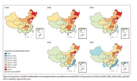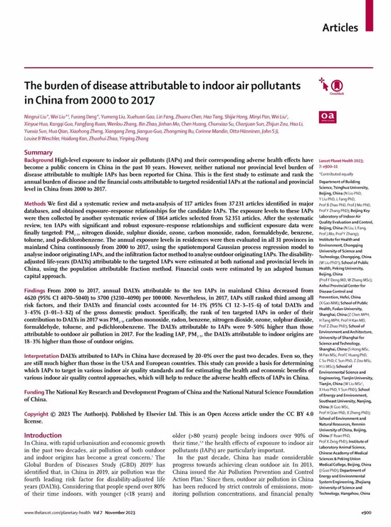 近日,环建学院室内环境与健康团队黄晨、宿春晓、孙婵娟、邹志军、李浩等教师联合国内多个研究团队的最新研究成果,以“中国2000年至2017年室内空气污染归因疾病负担”(The Burden of Disease Attributable to Indoor Air Pollutants in China from 2000 to 2017)为题,发表在医学领域著名期刊《柳叶刀·星球健康》(Lancet Planetary Health)上。研究首次定量评估了中国内地31个省级行政区的主要室内空气污染物造成的疾病负担及经济损失,为未来我国室内空气质量相关标准的主控污染物清单及其阈值修订,以及工程控制方略的确定提供了科学支撑和国情依据。该研究是在国家科技部重点研发计划等项目和国家自然科学基金项目资助下,与清华大学、复旦大学、北京大学等十余所高校研究者通过“医工交叉”合作完成的。 研究团队基于文献系统综述、荟萃分析和渗透系数法、时空高斯过程回归模型,获得了近20年中国内地全部省级行政区主要室内空气污染物浓度数据,以及我国室内空气污染物与心血管疾病、肺癌、白血病、哮喘等多种健康结局间的暴露反应关系,藉此采用人口归因分数,结合全球疾病负担数据,获得了我国室内空气污染暴露造成的疾病负担(DALYs即伤残调整生命年)和经济损失。 研究发现,从2000年到2017年,中国每10万人室内空气污染造成的疾病负担(DALYs)从4620下降至3700,2017年我国室内空气污染在总疾病负担中占比14.1%,相应经济损失为2.88万亿元,占当年GDP的3.45%,在所有健康风险因素中排名第三;2017年,中国疾病负担排名前十的室内空气污染物为PM2.5、一氧化碳、氡、苯、二氧化氮、臭氧、二氧化硫、甲醛、苯和对二氯苯,与欧美国家的排序差异明显;PM2.5疾病负担占比自2000年至2017年稳居第一;2017年室内空气污染疾病负担比室外空气污染高9.50%;中国每10万人室内空气污染的疾病负担约为美国的2倍、欧洲多国的4至6倍。为此作者指出,我国室内空气污染问题比欧美多国更严重,在室内空气质量控制方面,既要充分借鉴世界卫生组织或发达国家标准,又要充分考虑我国国情和各地区特点,对症下药、因地制宜地控制室内空气污染。