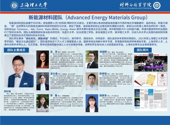 面向新能源技术发展和国家“双碳”战略的需求,材化学院新能源材料科研团队以郑时有教授为带头人,致力于储能材料的基础与应用研究工作。2023年获批国家和省部级项目共有8项,包括“十四五”国家重点研发计划“新能源汽车”重点专项子课题、国家自然科学基金委面上项目、上海市“科技创新行动计划”科技支撑碳达峰碳中和项目等,表明我校在储能材料领域的研究达到国内领先水平,获得同行的广泛认可,为学校和学院相关学科的发展提供支持。 团队现有6位教师和博士后1位,在电化学储能材料相关领域开展各具特色的创新研究,取得了诸多原创性成果。迄今承担国家自然科学基金14项及省部级项目超20项,发表学术论文近200篇,授权专利20余项,美国和日本国际专利各2项,获上海市自然科学一等奖(2018年)和二等奖(2022年)。