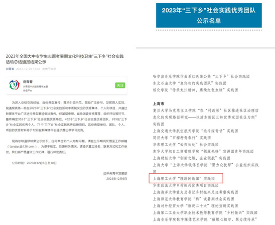 12月6日,共青团中央青发部公布了2023年全国大中专学生志愿者暑期文化科技卫生“三下乡”社会实践活动总结结果,我校学生校长助理“理助民新团”实践团脱颖而出,荣获全国“2023年‘三下乡’社会实践优秀团队”称号。