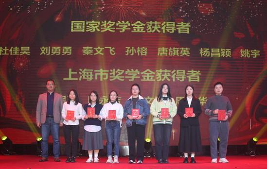 合唱《仰望星空》 晚会现场,姚秀雯、孔夏萌还分别为获得2023年国家奖学金、上海市奖学金的本科生及研究生颁发荣誉证书,并进行表彰。