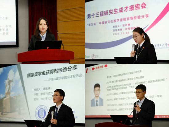 为深入学习贯彻党的二十大精神,发挥我校优秀研究生的榜样和示范作用,12月8日下午,由党委研究生工作部主办、环境与建筑学院承办的“秋炫沪江”研究生科技文化节系列活动之第十三届研究生成才报告会在光电学院报告厅举行。报告会邀请了来自能动、管理、环建和外语学院的四位优秀研究生,分享他们在党建、科研、创新创业、社会服务和实践等方面的典型经验,报告会吸引了来自各学院的近百名研究生代表与会学习交流。党委研究生工作部部长彭宗祥、环建学院党委副书记曹桂馥出席会议,会议由学院2023级研究生鲁振杰主持。 曹桂馥在致辞中阐释了举办研究生成才报告会的重要意义,他倡议研究生坚定理想信念,牢记使命,强化责任,锤炼优秀品格,积极响应新时代召唤,争做向上向善向美的好青年。 外语学院2022级外国语言文学硕士、2023年“行走的党课:感悟思想伟力·踔厉奋进新征程”主题实践红色游学活动特等奖获得者代俊璇,深入介绍了参加社会实践项目的背景、实施过程和收获,通过活动对学术成长和社会责任有了更多独特的思考。管理学院2023级管理科学与工程博士、“华为杯”第二十届中国研究生数学建模竞赛一等奖获得者张红柳,展示了数学建模竞赛的激烈与挑战,充分显示团队集智攻关、团结协作的协同精神。能动学院2021级能源动力硕士、2023年研究生国家奖学金获得者陆逸林,展示了他读研期间取得的优异成果,强调学业规划的重要性,要多与他人沟通,不断提高综合能力。环建学院2022级土木水利硕士、第六届进博会“小叶子“贾立峰,讲述了自己秉承着“奉献、友爱、互助、进步”的志愿精神做好进博会的各项服务工作,充分感受和见证了中国持续扩大高水平对外开放的信心和决心,以热情昂扬的服务态度亮出上理青年的靓丽名片,以实际行动向世界展示蓬勃向上的中国青年形象。交流互动环节,现场气氛活跃,在场的研究生们积极提问,代俊璇、张红柳、姚婷、陆逸林和贾立峰耐心为大家答疑解惑。