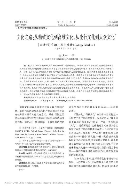 近日,由悉尼大学哲学系乔治·马尔库什撰写,版艺学院副教授付玉竹译作,发表于《学习与探索》的学术论文《文化之路:从精致文化到高雅文化,从流行文化到大众文化》被《新华文摘》(2023第14期)全文转载。 文章指出,从17世纪后期开始的文化观念经历了逐步的转变。其中“精致文化”的观念被包含艺术与科学的“高雅文化”所取代,而直到20世纪之交“高雅文化”真正的对立面“大众文化”才开始出现。本文分析了精致文化、高雅文化、流行文化以及大众文化产生的现实与文化背景,对它们的基本形态以及它们之间的对应关系进行了详细的分析与论述。文章还通过丰富的例证对“大众文化”现象及它与当代日常生活中社交活动的关系进行了详尽的分析,这不仅有助于我们深刻理解当代文化中的复杂现象,同时还能够帮助我们对当代艺术形态多样性背后的意义与价值作出更好的判断。 《新华文摘》作为我国最具影响力的人文社会科学权威学术文摘,是评价人文社会科学期刊学术影响和人文社会科学研究成果水平的重要参考依据。《新华文摘》与《中国社会科学文摘》《高等学校文科学术文摘》《人大复印报刊资料》是目前中国社会科学学术界公认的“四大文摘”。论文被其转载、摘登,标志着研究成果有较高的学术创新水平。