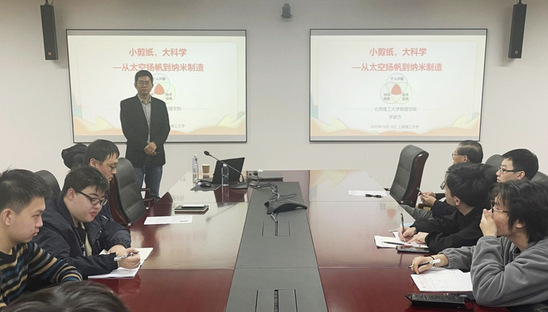 12月15日上午,国家杰出青年基金获得者、北京理工大学物理学院副院长李家方教授应邀来访我校,并在格致创新班报告会第三期活动中以“小剪纸 大科学——从太空扬帆到纳米制造”为题展开了一场精彩的学术报告。活动由光子芯片研究院副院长陈希教授主持,顾敏院士和格致创新班师生听取报告。 李家方教授以剪纸和折纸的发展简史入题,科普了剪纸和折纸原理在太空探索中的应用,详细介绍了纳米剪纸三维纳米制造技术及其在光子学领域的应用研究,指出物理基础规律决定了技术上限和突破方向,鼓励学生要利用好格致创新班平台,打好数理基础,开展科学探索。李教授深入浅出的讲解激发了格致创新班师生的浓厚兴趣。报告后,格致创新班师生针对纳米剪纸技术尤其是纳米剪纸的应用、形态和材料等方面与李教授展开热烈交流。最后,顾敏院士对格致创新班学生提出了相关要求,希望学生深度消化讲座内容,开拓思路,将报告内容与自已的科研兴趣紧密联系起来,在科研道路上勤于探索、勇于实践。