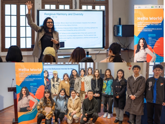 威廉姆斯博士向学生展示古典画作 从宝莱坞电影看印度社会文化 来自学院工商管理专业的讲师普里扬卡·达斯(Priyanka Das)以“宝莱坞视角下的印度社会文化认同”(Social Cultural Identity of India through the Lens of Bollywood)为主题,为让学生们更好地理解印度文化,她以宝莱坞的背景以及印度传统节日为切入点,选取了多部经典宝莱坞电影片段向同学们多方面诠释了丰富的印度文化以及其面对的各类社会问题,其中包括印度传统节日、家庭文化、包办婚姻与爱情婚姻的冲突以及对于社会歧视的探索等。