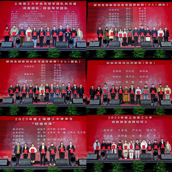 12月21日晚,我校2023年研究生颁奖盛典在大礼堂举行。出席颁奖盛典的领导及嘉宾有校党委副书记、副校长盛春,党委组织部部长孙红,党委宣传部部长叶磊,本科生院院长、学生工作部部长甘屹,规划发展处处长宇振盛,校团委书记刘威,研究生院常务副院长崔国民,研究生工作部部长彭宗祥,研究生工作部副部长、研究生院副院长王张琦,研究生院副院长彭斌,以及上海其他高校研究生会主席团代表、相关学院学生工作负责人、导师代表、辅导员代表、研究生代表等。 盛春在致辞中回顾了2023年我校研究生在创新实践系列大赛中取得的成绩,充分肯定了我校研究生创新创业人才培养工作。对营造“尊师重教、敬业爱生、教学相长、和谐互动”导学文化的优秀导学团队给予高度赞扬,并对全体研究生提出三点希望:一是希望同学们坚定理想,志存高远。自觉肩负起历史的重任,切实提高创新能力,激活创新创业思维,努力成为推动科学发展、社会进步的生力军;二是希望同学们以学为主,形成良好的学风。希望同学们仰望星空,脚踏实地,锤炼坚强的意志和品格,培养奋勇争先的进取精神,敢于面对各种困难和挫折;三是希望同学们社会实践,砥砺前行。希望研究生们广泛参加各类社会实践,认识国情、了解社会,自觉将理论与实践结合起来,在实践中不断提高创新能力,在实践中不断探求新知、追求真理,永葆思想活力。 本次颁奖盛典共分为三个篇章,分别是“青衿之志,履践致远 ”“奋楫笃行,臻于至善”“风正扬帆,踵事增华”,颁发了上海市学习贯彻党的二十大精神微宣讲大赛百强入围个人、研究生样板党支部、红色游学优秀项目、优秀导学团队、科创先锋、创新创业优秀指导教师、创新创业金牌经纪人、优秀劳动者等13个奖项。