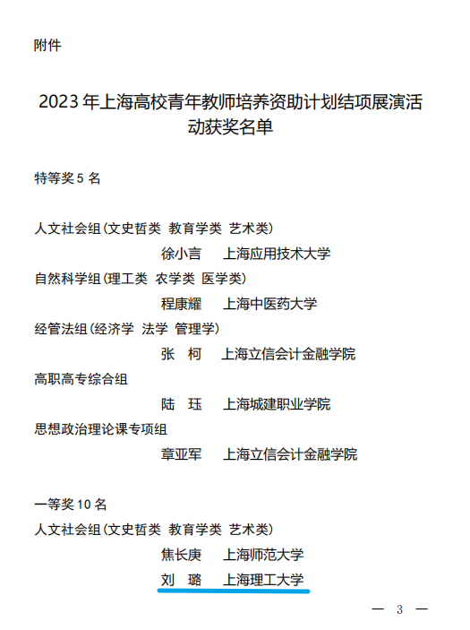 11月25日、26日,上海市教育委员会、上海市教育发展基金会举办了第四届“上海高校青年教师培养资助计划”结项展演活动,此次展演从2021年“上海高校青年教师培养资助计划”入选教师中遴选了75名优秀青年教师参加,活动设立人文社会、自然科学、经管法、高职高专、思想政治理论课五个展演组别,版艺学院教师刘璐获人文社会组一等奖。 在此次展演活动中,刘璐参加展演的课程为“广播电视概论”,结合在教育教学实践中形成的课程思政教学案例进行了现场展示,在深化课程教学内容的学术性、实践性、前沿性的同时,将知识传授与价值引领有机融合,强化找准了学科的价值属性,推进课程思政教育教学改革。 学院始终高度重视青年教师的成长,鼓励青年教师积极参与到各项赛事之中,为青年教师成长搭建成长平台、创造发展机会,逐渐形成团队协作、梯队发展、共同进步的良好局面。