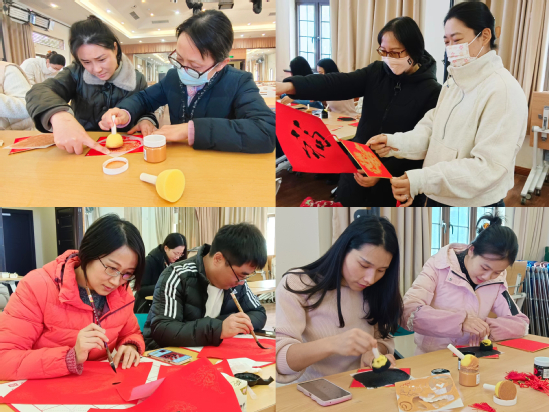 欢声话丰稔,笔墨贺新年。在新年钟声敲响前夕,12月27日下午,校工会在教工之家组织开展了教职工“迎新送福”活动,为全校教职工送上最真挚美好的祝福。沪江学院书法教师董剑戟应邀作艺术指导,各部门、各基层工会的60余名教职工参加活动。 活动中,董剑戟老师向参加活动的教师代表分享了书法艺术的美学蕴涵以及桃符对联的美好寓意,分别用篆书、隶书、楷书、行书、草书等5种书体向教师代表演示了“福”字的书写要领,并对大家的现场书写进行了逐一辅导。校工会李沁芯老师带领老师们开动双手,亲自体验了国家级非物质文化遗产名录中的“拓印”技艺,绘制出一张张生龙活虎的福字,让老师们在非遗文化中赞叹技艺的绝妙与精湛。现场教职工们相互交流分享,活动气氛热烈,受到大家的一致喜爱和欢迎。 福字不仅寓意着对新年的美好期盼,更饱含着对美好生活的向往,也寄托了对学校发展蒸蒸日上的祝愿。现场,教职工们在书写福字、拓印福字的过程中,深深体会到中华优秀传统文化的厚重感和感染力,也充分表达了参加活动的喜悦和收获。大家表示,在新的一年里,一定会以“龙腾虎跃”的饱满精神,为学校建设特色显著一流理工科大学而贡献力量。校工会也将一如既往引导广大教职工坚定文化自信,担负起新的文化使命担当使命,为中华民族现代文明发展做出一份贡献。