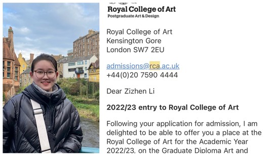 张烨儿(已被英国皇家艺术学院信息体验设计专业录取) 【相关】 皇家艺术学院(Royal College of Art,简称: RCA)始建于1837年,位于英国伦敦,是全球唯一的全研究制艺术院校。仅授予硕士和博士学位,无本科教育。在历年的QS世界大学学科排名中,该校一直稳居世界第一,超越美国麻省理工学院、罗得岛设计学院、英国伦敦艺术大学等一众知名学府。该校仅招收来自世界各国最具艺术才华的学生和艺术家,入学竞争激烈,录取率极低,是全球迄今为止历史最悠久的艺术院校之一,被誉为“全球艺术家与设计大师的摇篮”,培养出众多享誉全球的艺术家与设计师。 录取同学名单:版艺学院视觉传达设计专业黄俊鑫、李梓圳、陆彦好、张烨儿、陈鸿飞;版艺学院工业设计系张忠宇、倪王霞、姜宝涵。 供稿:版艺学院 |