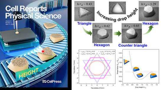 4月17日,能动学院硕士研究生姜芋鹏在导师赵玉刚副教授的指导下,在《细胞》(Cell)旗下期刊《细胞通讯·物理科学》(Cell Reports Physical Science)上发表“基于多变形纳米流体液滴凝固的三维制备工艺”(Three-dimensional shaping strategy via solidifying polygonal nanofluid drops)的研究论文,并被选为当期封面文章。研究生姜芋鹏为该论文第一作者,赵玉刚为通讯作者,该成果由上海理工大学能动学院张华教授、上海交通大学郑平院士和新加坡南洋理工大学杨纯教授共同指导完成,主要研究报道了一种全新的三维加工成型技术,通过调节纳米流体液滴参数可以实现精准成型。 该成果主要服务增材制造、注塑成型和光刻等三维加工工艺,可广泛用于制造多用途材料和复杂结构的小型物体。但现有技术通常依赖于大型设备和复杂流程,因此,亟需一种新的三维结构制造技术,保证结构可靠的同时可以简化制造流程,从而提高生产效率。由于液滴凝固具有灵活性和可调控性,现有研究通过调节表面形貌结构或化学润湿性,仅能实现二维平面上控制液滴形状。 本文通过调控液滴凝固行为,首次实现了三维空间内的形状控制,并得出液滴三维无模成型的基本规律,将液滴形状调控从二维层面转向三维层面,为介微观三维结构的加工制造提供了一种全新方法。研究人员制备具有多边形的双浸润性表面,通过固定纳米流体液滴的接触线,在低温台上观察其凝固的过程,得到液滴高度和凝固后平台形状之间的变化规律。研究结果表明:三角形接触线固定的纳米流体液滴,凝固后平台形状随着高度的增加依次经历了三角形、六边形、反三角和六边形。理论计算和实验对比表明,复杂约束表面上的液滴可以被看作是具有不同接触半径的接触球,在给定液滴高度的情况下,会产生不同大小的顶部平台,这些尺寸的变化将决定凝固后最终顶部平台的形状。研究引入了形变因子,以两种机制描述随高度变化的颗粒堆积、界面流动和平台构造的作用传递机制。 本研究得到了国家自然科学基金(No.52276079)、空间探索实验计划(批准号TKTSPY-2020-01-01)、国家重点项目(批准号2020YFF0303901)、上海市地方科技发展基金中央指导意见(YDZX20213100003022)的资助。