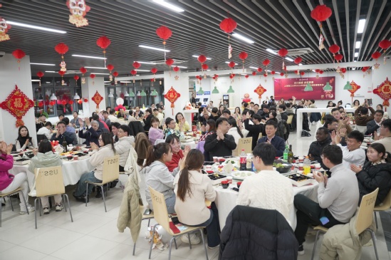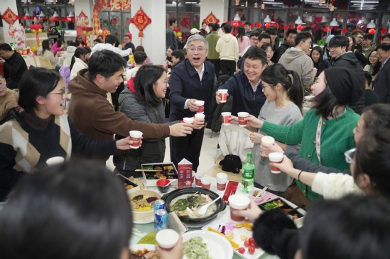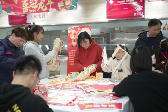 年俗活动现场师生一同感受传统节庆的文化氛围和艺术魅力 校党委书记王凌宇在年夜饭伊始致新春祝福,为现场师生送上新年问候和祝福。校长丁晓东也为师生献唱一首,将现场气氛推至高潮。后勤处餐饮中心精心准备了牛气冲天(盐水牛肉)、展翅高飞(可乐鸡翅)、招财进宝(元宝虾)等寓意美好的定制菜谱,色香味俱全,洋溢着浓厚的“年味儿”,承载着美好的祝愿,表达了学校对留校师生的浓厚情意。