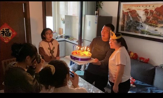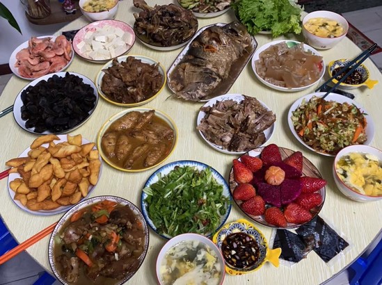 朱晓平家的年夜饭 朱晓平非常珍惜过年与家人短暂团聚的时光。“大年初一,我们家例行去三姨家吃饭,从小我就很期待这一天,因为可以领红包又可以吃到新年的第一块蛋糕。酒足饭饱之后,我们会组两桌人,一桌玩打滚子(起源于大连,在辽宁一带广泛流行的牌类游戏),一桌玩麻将,热热闹闹便是年。”