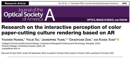 近期,印刷包装工程系新媒体技术专业本科生在科艺融合方面再出佳绩,由袁江平老师指导的2020级本科生黄雨辰在美国光学老牌期刊《美国光学学会杂志-A刊》(Journal of the Optical Society of America-A)(中科院三区期刊)以第一作者身份发表学术论文《基于AR技术的彩色剪纸文化传承的交互感知研究》(Research on the interactive perception of color paper-cutting culture rendering based on AR),2020级本科生徐钰蕾为第二作者。 在新兴科技飞速发展的当代,彩色剪纸由于工艺技法难且纸媒介单一,导致其传承艰难及发展日益受限。为了更好地服务千禧一代,本文将增强现实技术(Augmented Reality, AR)运用于彩色剪纸文化传承,并基于3ds max和Unity3D平台开发出一款通过扫描剪纸实物提供移动端数字剪纸感知增强交互的APP。为进一步提高数字化彩色剪纸的吸引力,增强用户感知上的交互效果,本文基于主观评价法及标准观察者对所设计的四类数字化彩色剪纸模型(点彩剪纸、衬色剪纸、剪绘剪纸、彩贴剪纸)的美感、观感、印象共三个方面进行交互感知评价实验,探究载体背景色调与光线组合、动画播放速度及叠放层次顺序对彩色剪纸呈现效果的影响。这为彩色剪纸文化衍生设计及AR感知提供了参数依据,从而以数字化的方式实现了彩色剪纸非遗文化的保护与传播。 在市级大学生创新创业实训过程中,两人勇于实践、大胆创新,不仅掌握了多项基本实验技能,在信息检索、文献阅读和英文写作方面的能力也得到了极大提升。据了解,黄雨辰同学已推免南方科技大学硕士研究生。 该论文的发表是版艺学院重视本科教学实践和学生培养的一个重要成果,此项工作也得到了国家自然科学基金、上海理工大学版艺学院启航基金、教育部产学合作协同育人项目及2023年上海理工大学教师产学研践习计划的资助。袁江平老师也于2023年12月获得上海市浦江人才计划(省级人才)资助,为电子信息与包装机械方向的硕士生导师,欢迎更多跨学科的本科生加入该创新团队。