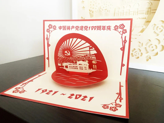“光耀百年”纸制品创意设计—— 一大会址 在社会服务实践方面,本支部联合学院本研设计类学生党支部,不间断深入乡村、社区和文创产业,开展服务长三角地区、辐射全国的红色文化形象、文创设计作品开发及社区微更新、美丽乡村设计、老年友好环境设计服务,目前已经开发出的设计成果主要包括:“光耀百年”主题纸制品创新设计;内江路384弄小区墙绘、松花江路40弄军民同心园、延吉东路5弄同心楼等社区微更新项目;马桥镇友好村愿景规划等美丽乡村设计项目;认知症友好中心设计等老年友好环境设计项目;“百年风华”、建党百年国家外交文创设计等文创作品设计项目。