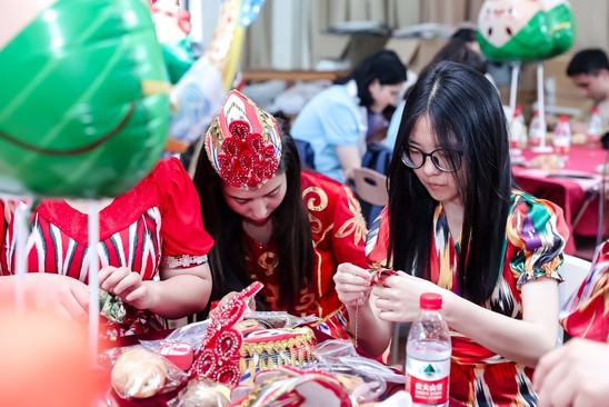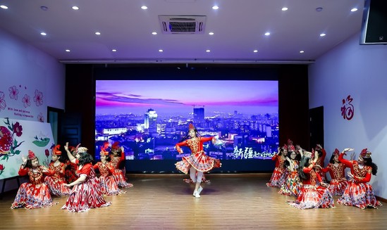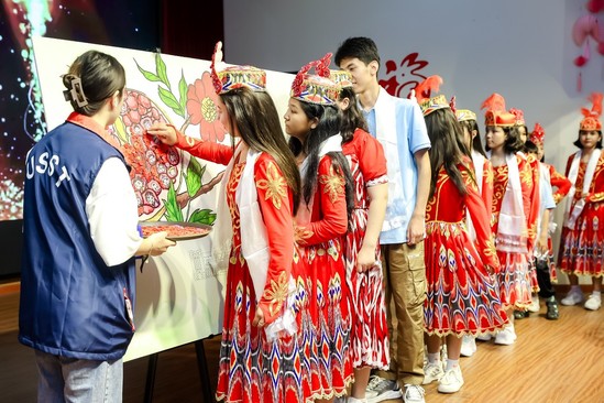 6月3日下午,一批身着鲜艳民族服饰的新疆莎车县中小学师生代表团在莎车县相关领导的带领下,与学校师生开展了一场别开生面的中华传统文化交流活动。副校长张华,教务处、学生工作部(处)副部(处)相关负责人及玛丽亚民族团结工作室负责人、师生代表等参加活动。 张华在致辞中对远道而来的新疆师生表示欢迎,并简要介绍了学校基本情况和语言文字工作情况,从“述古雕今,共谋文化繁荣”“志存高远,共建现代新疆”以及“合作互助,共育固边人才”三个方面交流了学校在推进教育援疆、科研助疆、文化润疆等工作中做出的努力及取得的成果。他表示,对口支援新疆是党中央交给上海的光荣政治任务,学校将深入学习贯彻习近平总书记重要讲话精神,在促进沪疆教育资源共享方面加强协作,在落实国家重大战略上加强协同,为支持新疆的教育发展做出上理贡献。 交流会上,在场师生以每人粘贴一颗纽扣的方式,共同拼出一副“石榴花开”展画,颗颗相依的“石榴籽”犹如中华各民族儿女紧密相连,团结一心。共筑“石榴花”,同追中国梦,这幅充满希望和活力的画卷,汇聚了上理师生和新疆莎车县师生代表团的拳拳爱国之心。 上理学子展示了《祖国,或以梦为马》《少年中国说》等朗诵节目,代表团学生带来了舞蹈《新疆是个好地方》和戏曲《说唱脸谱》等节目, “民族团结模范家庭”马玉英和张耀辉夫妇带来《双人舞》表演。此外,玛丽亚民族团结工作室的“书声意气”团队将第429 期 “读书分享会”也带到交流会现场,带领新疆师生沉浸式体验了一场特殊的读书沙龙。临近传统节日端午,导读人由分享文学作品引入,讲解了我国各传统节日知识,并与在场代表团学生展开趣味问答和制作端午香包等生动有趣的互动。交流会后,代表团参观了玛丽亚民族团结工作室和机械艺术博物馆。 本次交流活动由上海援疆莎车分指、莎车县委宣传部与莎车县教育局主办,旨在促进上海与新疆两地学生文化交往交流交融,增进少数民族师生的文化认同、思想认同、情感认同,增强民族团结的理论深度、实践力度、情感温度,共同践行“中华民族一家亲、同心共筑中国梦”。