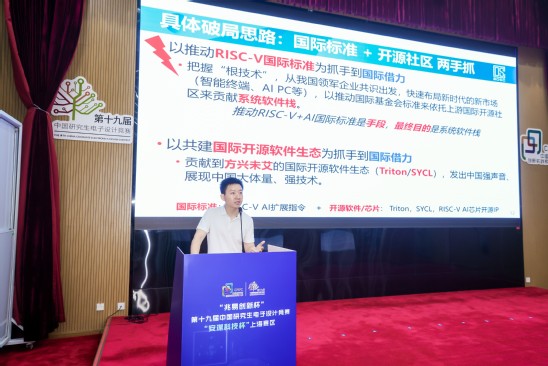 同时,企业代表安谋科技(中国)有限公司市场经理宋斌作为赞助企业代表,对大赛的成功举办表示祝贺,他坚信在教育部学位与研究生教育发展中心、中国科协青少年科技中心、中国电子学会的带领下,中国研究生电子设计竞赛一定会发挥更大的引领作用。上海大学王瑞教授和上海理工大学机械工程学院2023级硕士研究生连越,分别作为评委及参赛学生代表进行宣誓。