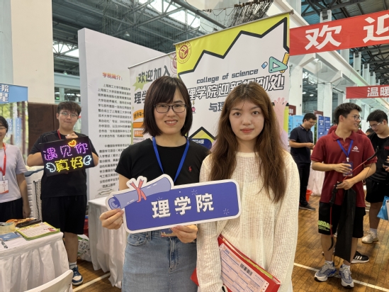 理学院展台 是校园“接驳员”也是移动的“指南针” 报到第一天的校园里,奔忙着“小红”“小白”的身影,他们是学校的迎新志愿者。为新生和家长进行路线引导、帮忙把行李抬上楼、讲解电器和生活设施的使用……机械工程学院的刘兆宏6点出头就起床了,拖着小板车在毛主席像广场和学生宿舍之间担任“接驳”工作:“一早上来回了十几趟,我还是大一新生的时候学长学姐也给了很多帮助,于是今年就报名了志愿者,希望把这种有爱的氛围传承下来,展现我们上理大学生的风采。”