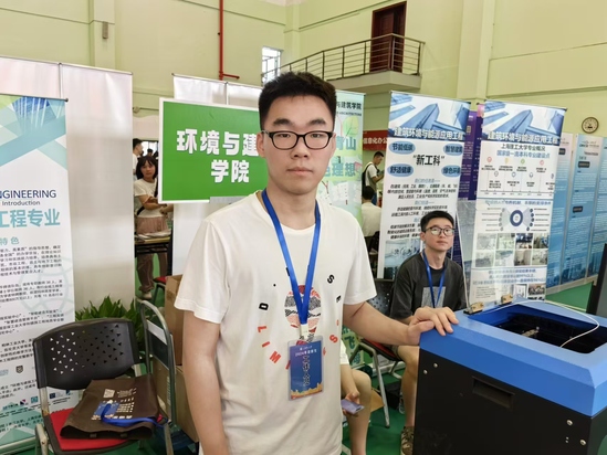 环建学院高恩泽在迎新站台向新生作“0尘土”演示