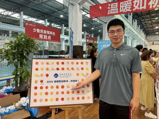 新生李恩霖将1945年沪江建筑系毕业纪念册捐赠给学校档案馆 “这本纪念册的主人是沪江大学建筑系校友沈懿平先生,穿越了近80年的光阴,我也来到上理工读书,觉得是特别的缘分,就和爸妈商议后,将它作为入学的礼物无偿捐赠给学校。”李恩霖介绍,纪念册中的大学生西装笔挺、风华正茂,这份精气神也激励着自己,希望在上理工这座历史悠久的校园里踏实学习,以老学长学姐们为榜样,努力干出自己的成绩。 学校与新生双向奔赴互赠纪念品,让历史与现在有了呼应:精美原创的亚克力钥匙链、徽章、金属冰箱贴、学院历史沿革纪念书签、手工流麻作品……出版学院将师生在专业课堂上、毕业设计中精心设计的文创作品带到了迎新展台,作为送给新生的见面礼,形式新颖又充满纪念意义,让新生对专业学习充满期待和信心。 出版学院设计类新生朱张婧因爱好集章在展台前,体验收集了来自动画系版画课堂的校园标志性建筑物原创印章,收获满满:“现场学长学姐的课程作品、毕业优秀作品、龙鳞装帧书籍、纸雕灯、手工陶艺作品等让我们大开眼界,可感知可触摸的真实的学习成果让刚刚踏入校园的我们对未来‘可学’‘所学’有了更为清晰的认知,大类分流后,我想学产品设计,希望这一年好好努力,为顺利进入心仪的专业‘加码’。”